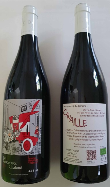 Bouteille de vin BIO du domaine Salisquet de Vianne (47) avec étiquette reprenant le visuel de l’affiche des Rencontres Chaland 2025 par Stanislas